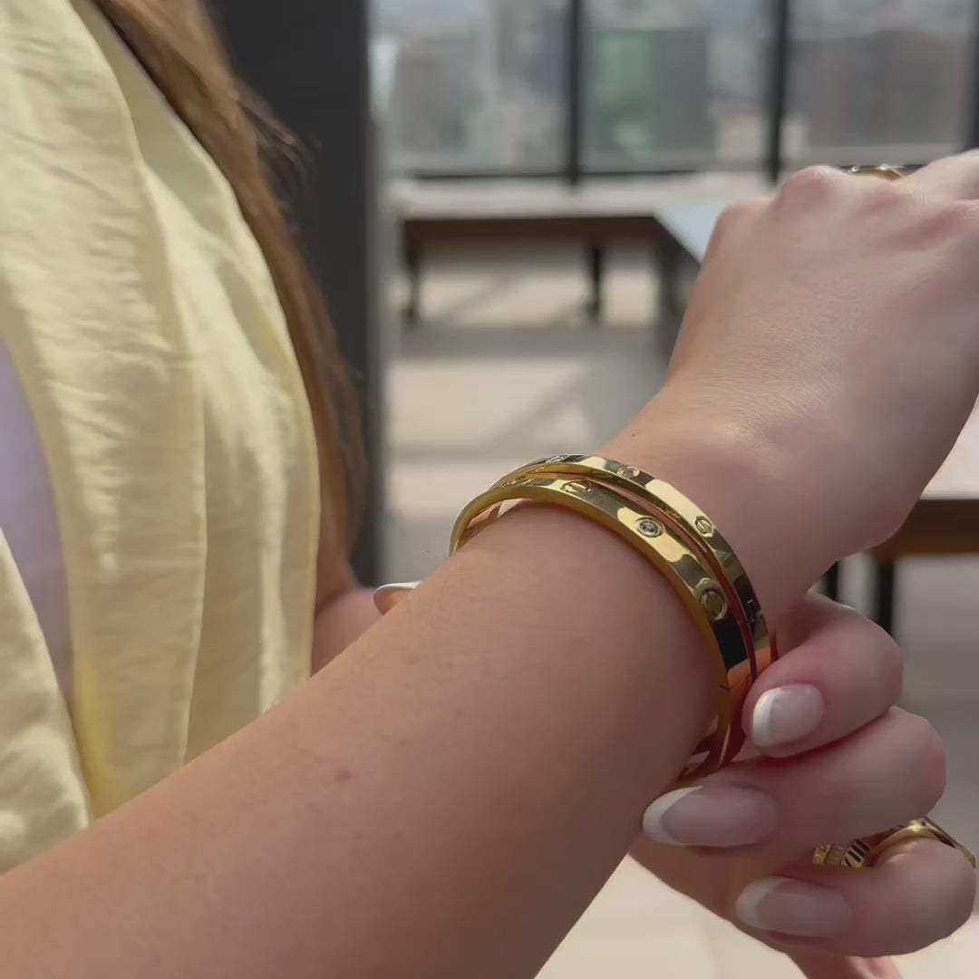 O aço inox aliado ao banho em ouro 18k oferece proteção contra o contato com água salgada e cloro, mantendo o brilho e a cor mesmo com o uso frequente.